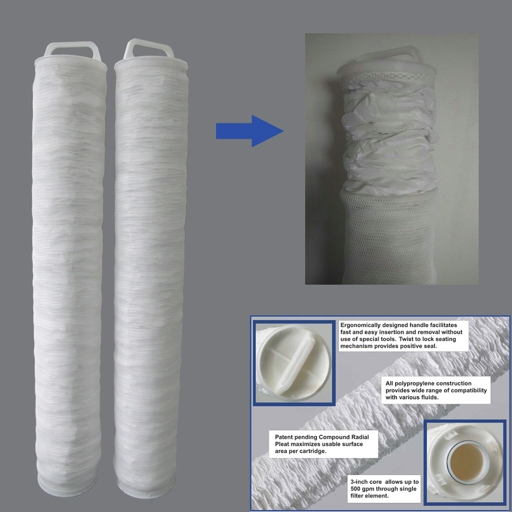 Nuestros cartuchos filtrantes de alto flujo están equipados con una membrana de alta precisión, ofreciendo una precisión de filtración de 1 a 100μm y una tasa de interceptación de partículas de impureza del 98%. Disponibles en longitudes de 20", 40" y 60", estos cartuchos pueden ser adaptados para capturar una amplia gama de impurezas, lo que los hace excepcionalmente adecuados para sectores como el farmacéutico, químico, electrónico y petrolero.